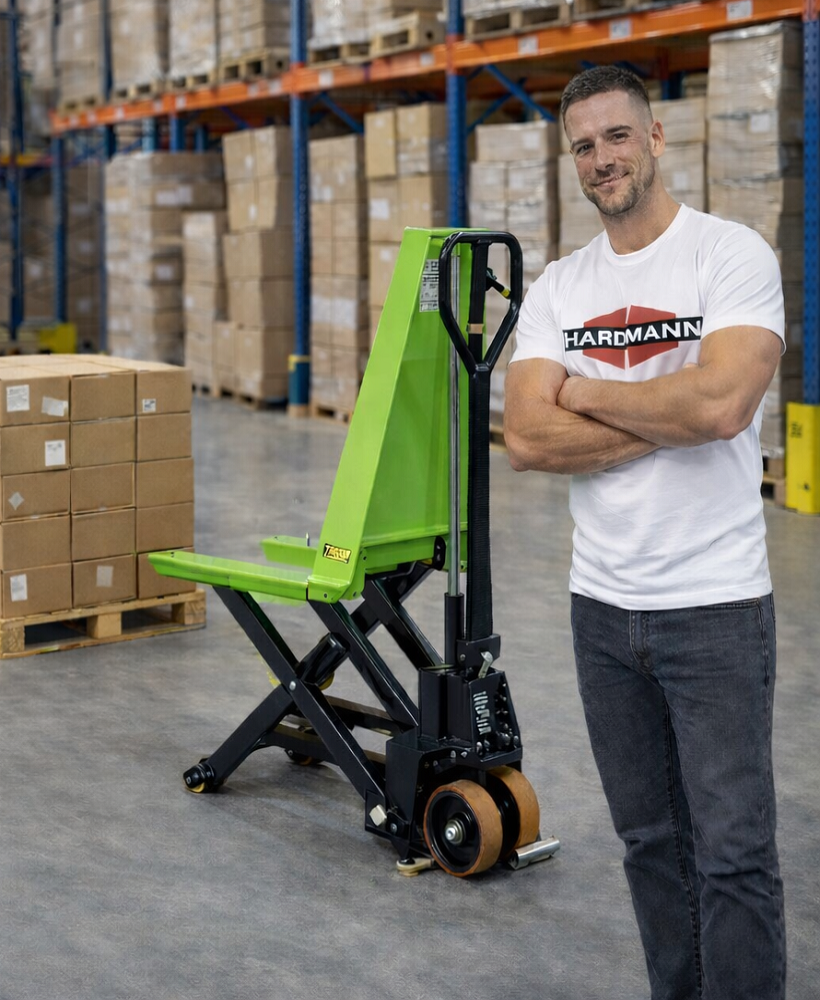Transpalette à grande levée, système hydraulique manuel, force 1000 kg, longueur fourches 1150 mm. Charge max. = 1000 kg.